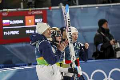 Timi ZAJC, SLO, bib number 33, Anze LANISEK, SLO, bib number 47, Domen PREVC, SLO, bib number 50, Action Photo, Men's Normal Hill HS107 at Ski Jumping Olympic Winter Games 2025-26 in Milano Cortina, Italy, 2026-02-09, Photo Credit: action press / Julia Piatkowska/KarmaPress / AGENZIA ALDO LIVERANI SAS ITALY ONLY EDITORIAL USE ONLY