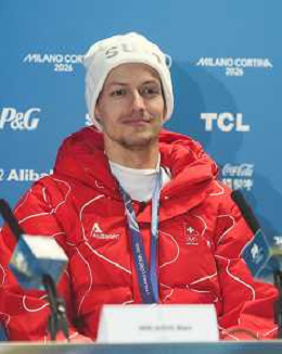 Gregor DESCHWANDEN, SUI, bib number 31, Press Conference, Event Photo, Men's Normal Hill HS107 at Ski Jumping Olympic Winter Games 2025-26 in Milano Cortina, Italy, 2026-02-09, Photo Credit: action press / Julia Piatkowska/KarmaPress / AGENZIA ALDO LIVERANI SAS ITALY ONLY EDITORIAL USE ONLY