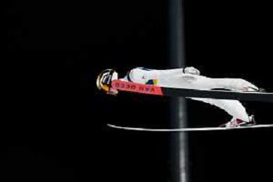 Vitaliy KALINICHENKO, UKR, bib number 12, Action Photo, Men's Normal Hill HS107 at Ski Jumping Olympic Winter Games 2025-26 in Milano Cortina, Italy, 2026-02-09, Photo Credit: action press / Julia Piatkowska/KarmaPress / AGENZIA ALDO LIVERANI SAS ITALY ONLY EDITORIAL USE ONLY