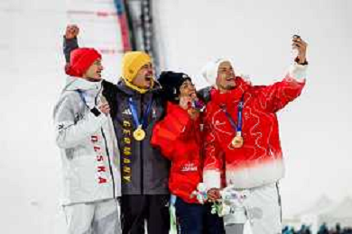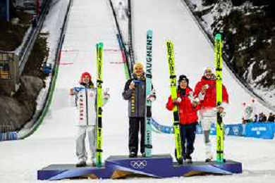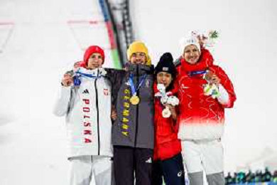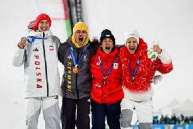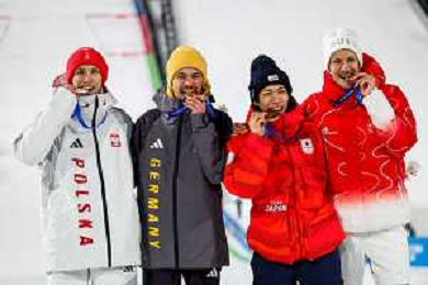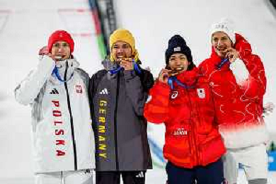 Kacper TOMASIAK, POL, bib number 38, Philipp RAIMUND, GER, bib number 45, Ren NIKAIDO, JPN, bib number 48, Gregor DESCHWANDEN, SUI, bib number 31, Podium Photo, Men's Normal Hill HS107 at Ski Jumping Olympic Winter Games 2025-26 in Milano Cortina, Italy, 2026-02-09, Photo Credit: action press / Julia Piatkowska/KarmaPress / AGENZIA ALDO LIVERANI SAS ITALY ONLY EDITORIAL USE ONLY