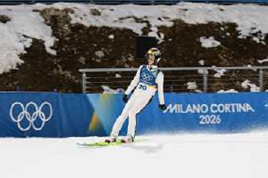 Alex INSAM, ITA, bib number 18, Action Photo, Men's Normal Hill HS107 at Ski Jumping Olympic Winter Games 2025-26 in Milano Cortina, Italy, 2026-02-09, Photo Credit: action press / Julia Piatkowska/KarmaPress / AGENZIA ALDO LIVERANI SAS ITALY ONLY EDITORIAL USE ONLY