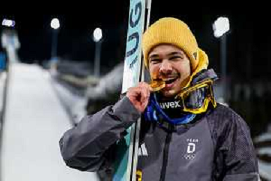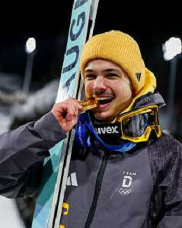 Philipp RAIMUND, GER, bib number 45, Winner Photo, Men's Normal Hill HS107 at Ski Jumping Olympic Winter Games 2025-26 in Milano Cortina, Italy, 2026-02-09, Photo Credit: action press / Julia Piatkowska/KarmaPress / AGENZIA ALDO LIVERANI SAS ITALY ONLY EDITORIAL USE ONLY