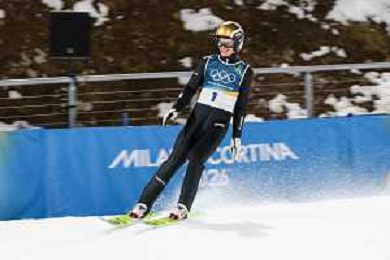 Enzo MILESI, FRA, bib number 1, Action Photo, Men's Normal Hill HS107 at Ski Jumping Olympic Winter Games 2025-26 in Milano Cortina, Italy, 2026-02-09, Photo Credit: action press / Julia Piatkowska/KarmaPress / AGENZIA ALDO LIVERANI SAS ITALY ONLY EDITORIAL USE ONLY