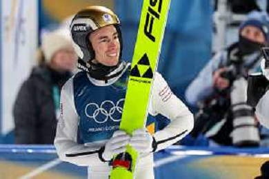Gregor DESCHWANDEN, SUI, bib number 31, Winner Photo, Men's Normal Hill HS107 at Ski Jumping Olympic Winter Games 2025-26 in Milano Cortina, Italy, 2026-02-09, Photo Credit: action press / Julia Piatkowska/KarmaPress / AGENZIA ALDO LIVERANI SAS ITALY ONLY EDITORIAL USE ONLY