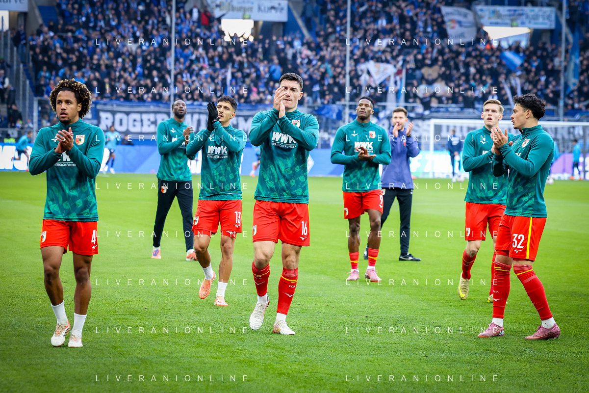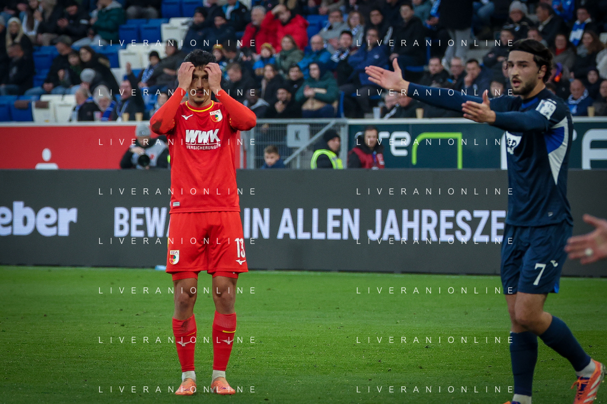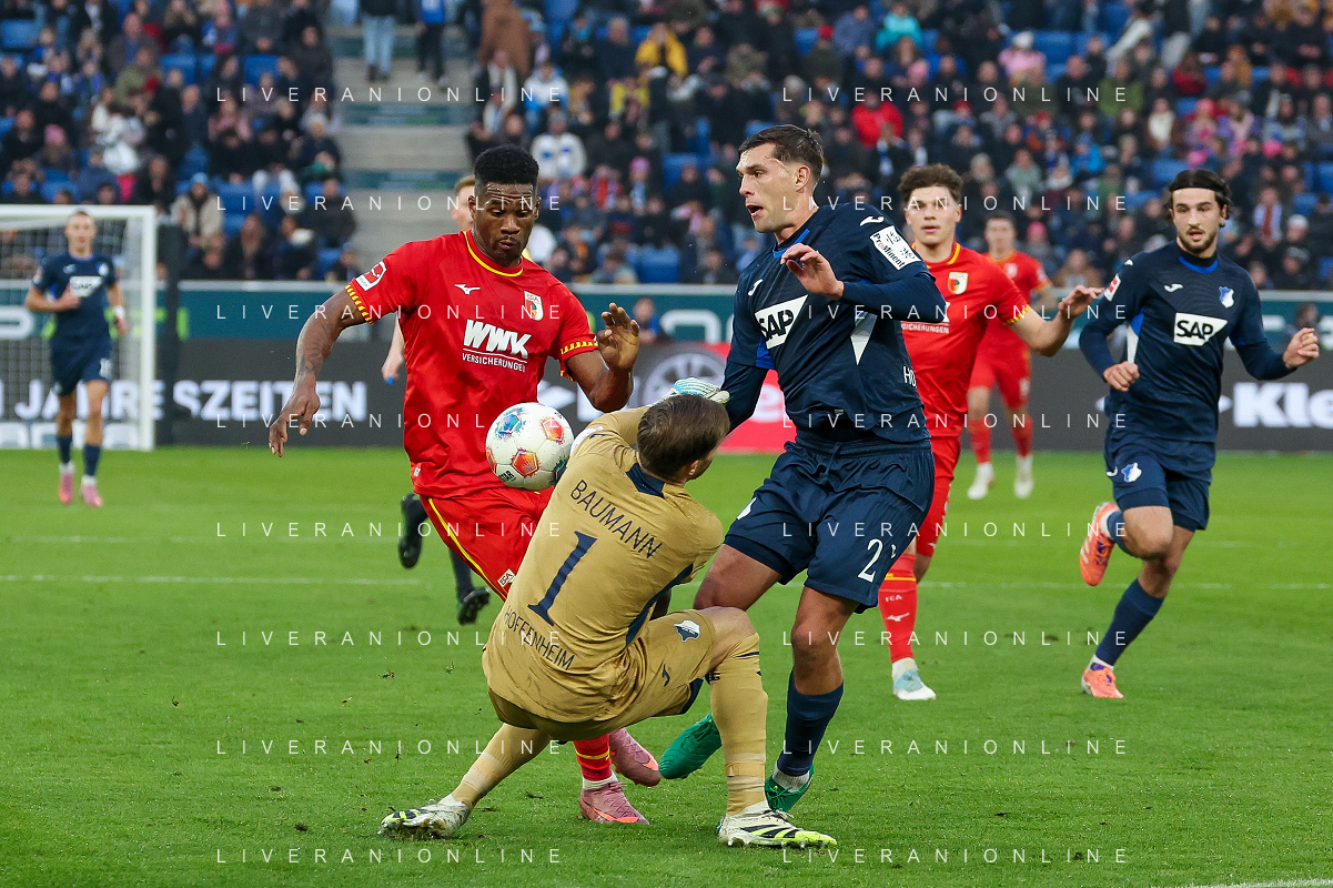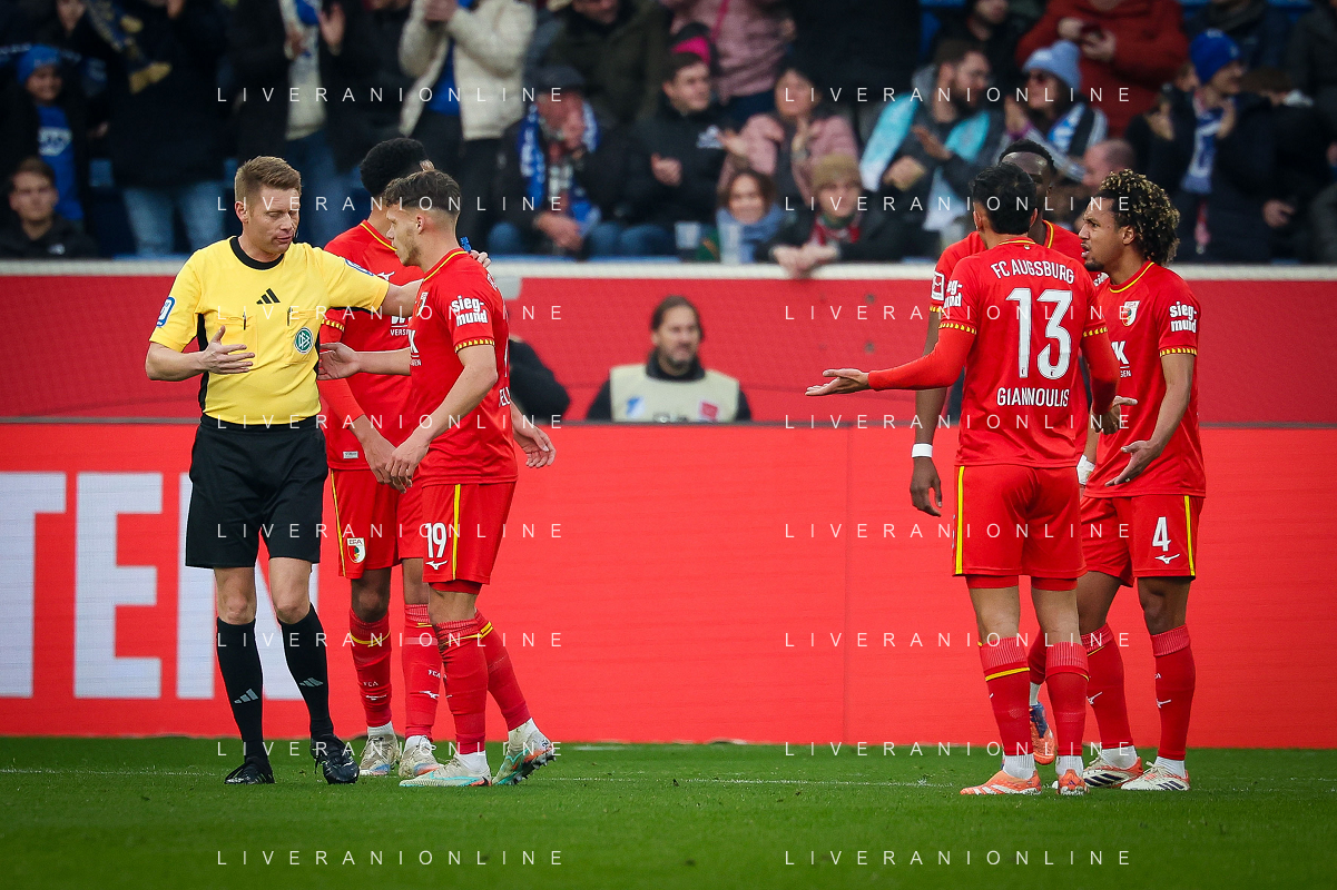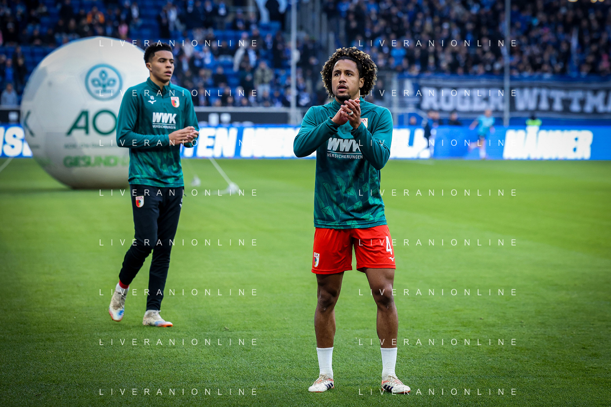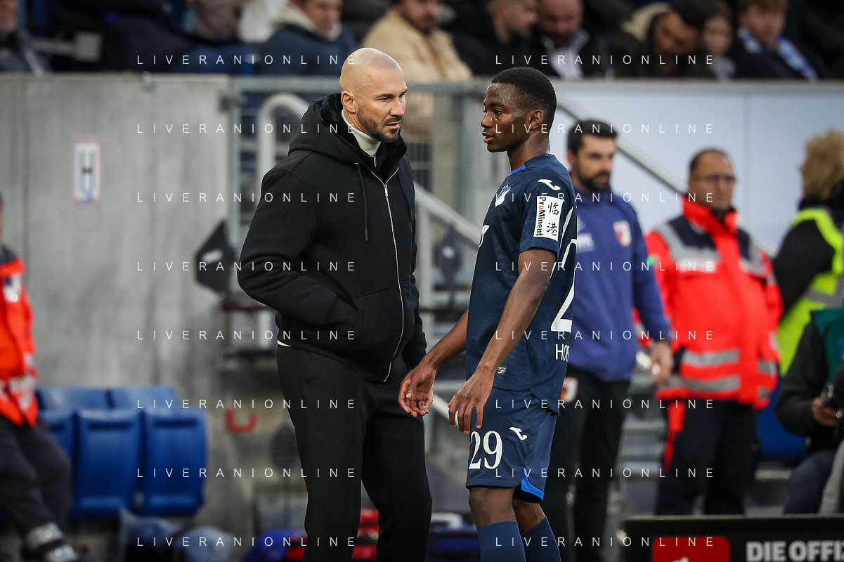 Han-Noah Massengo #4 FC Augsburg), Cedric Zesiger #16 (FC Augsburg), Anton Kade #30 (FC Augsburg), Fabian Rieder #32 (FC Augsburg), Dimitris Giannoulis #13 (FC Augsburg) gruessen die Fans vor Spielbeginn, TSG Hoffenheim vs. FC Augsburg, Fussball, Bundesliga, DFL, Saison 2025/2026, Hinrunde, 12. Spieltag, 29.11.2025 DFB regulations prohibit any use of photographs as image sequences and/or quasi-video / action press AG KARMAPRESS-AG ALDO LIVERANI SAS / AGENZIA ALDO LIVERANI SAS ITALY ONLY EDITORIAL USE ONLY