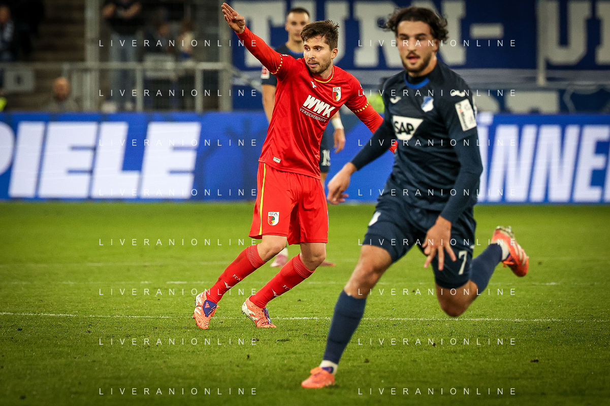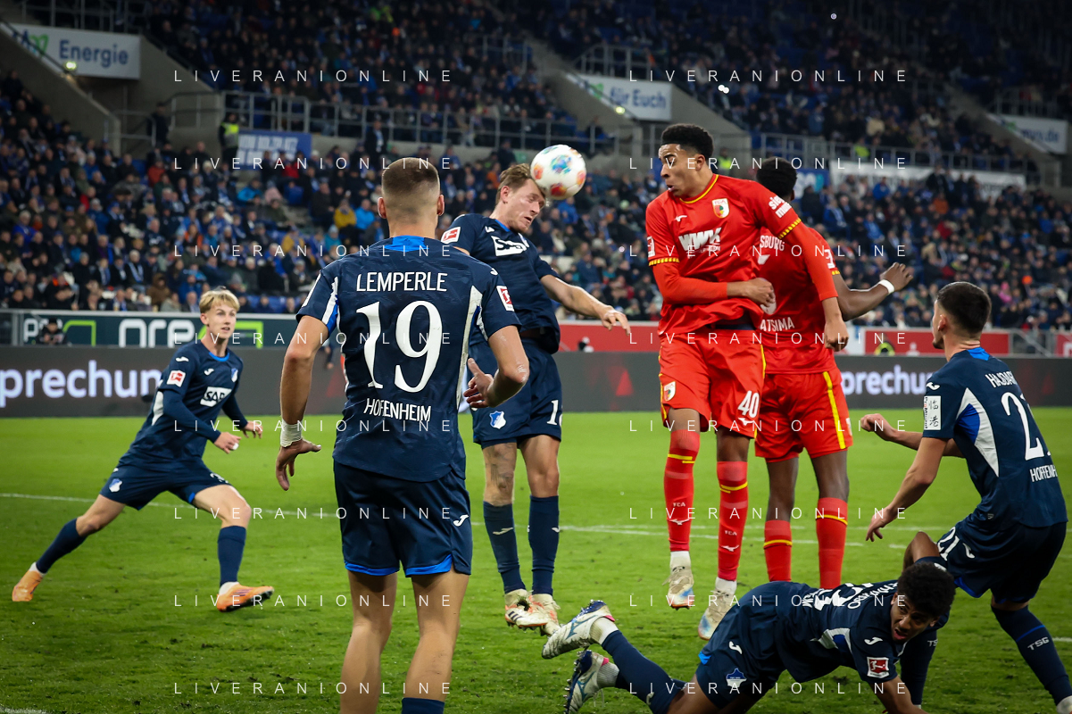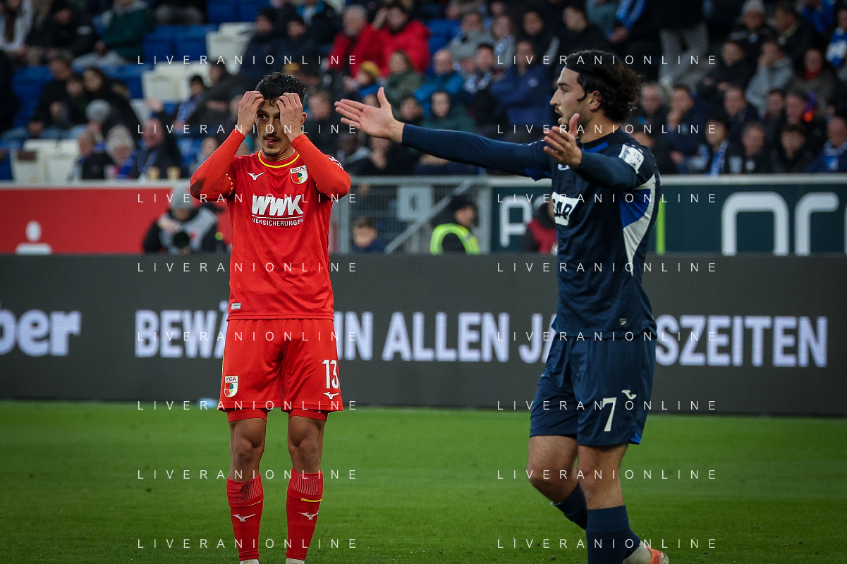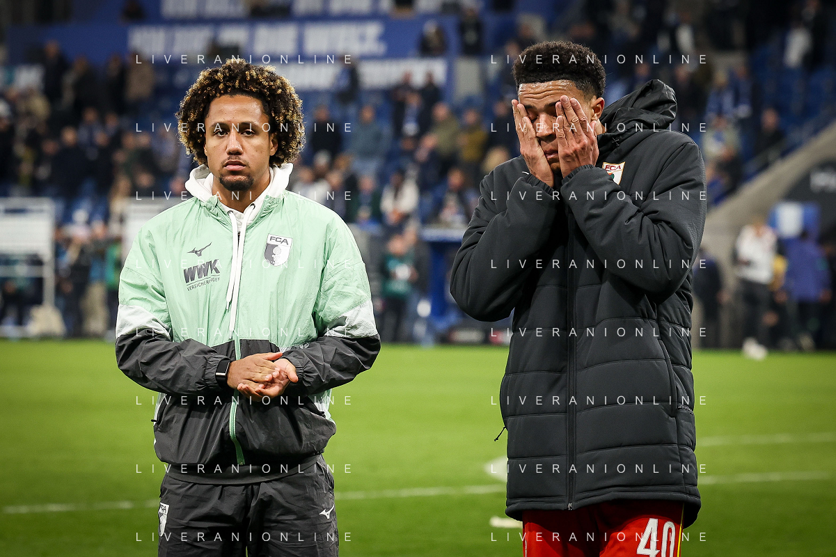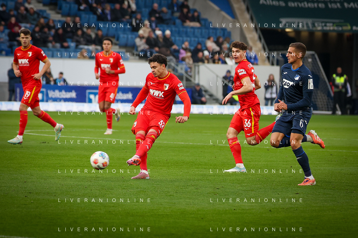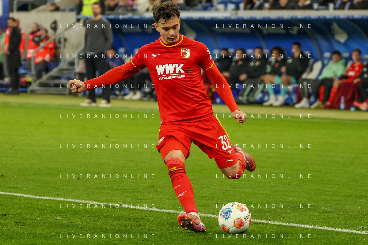 Han-Noah Massengo #4 FC Augsburg), Cedric Zesiger #16 (FC Augsburg), Anton Kade #30 (FC Augsburg), Fabian Rieder #32 (FC Augsburg), Dimitris Giannoulis #13 (FC Augsburg) gruessen die Fans vor Spielbeginn, TSG Hoffenheim vs. FC Augsburg, Fussball, Bundesliga, DFL, Saison 2025/2026, Hinrunde, 12. Spieltag, 29.11.2025 DFB regulations prohibit any use of photographs as image sequences and/or quasi-video / action press AG KARMAPRESS-AG ALDO LIVERANI SAS / AGENZIA ALDO LIVERANI SAS ITALY ONLY EDITORIAL USE ONLY
