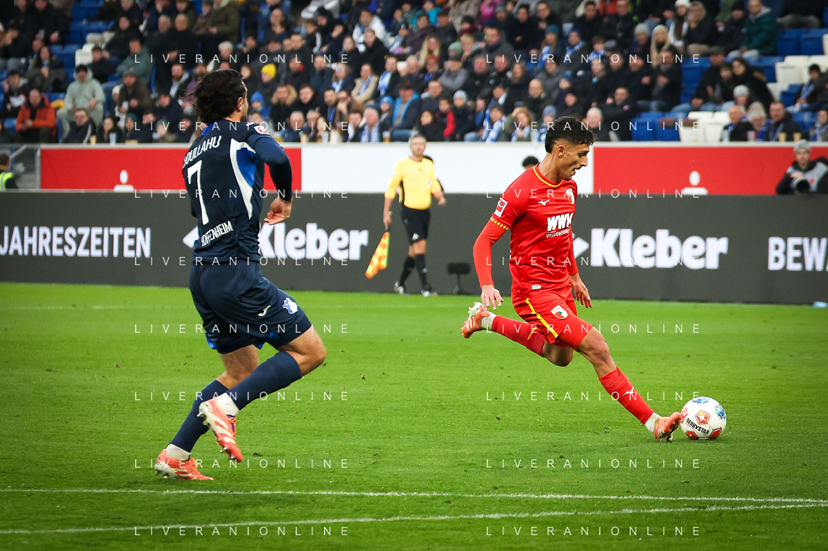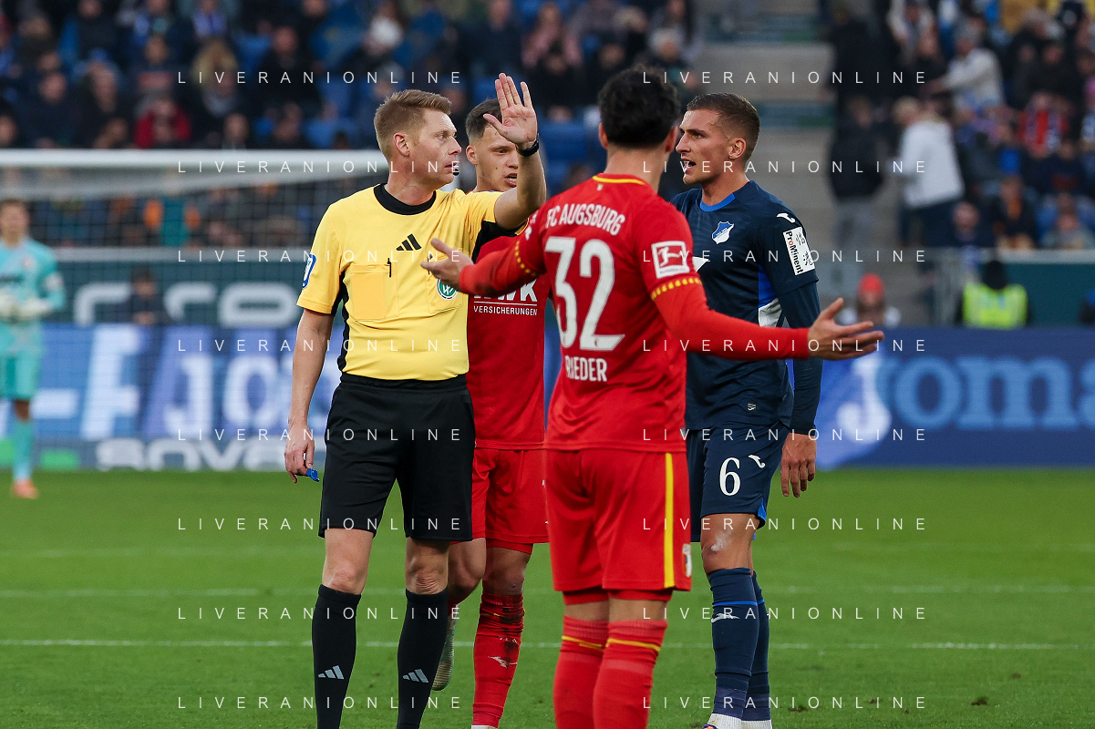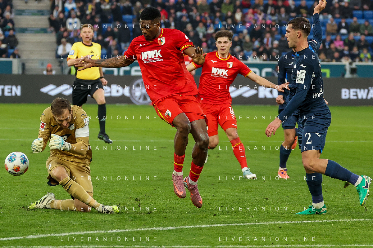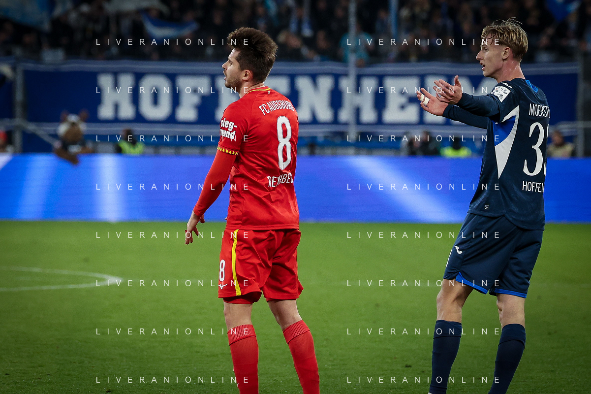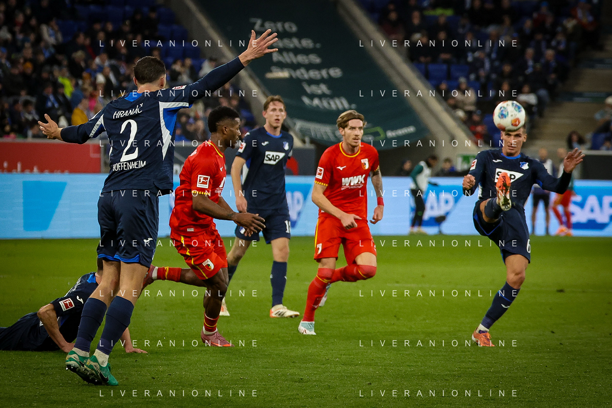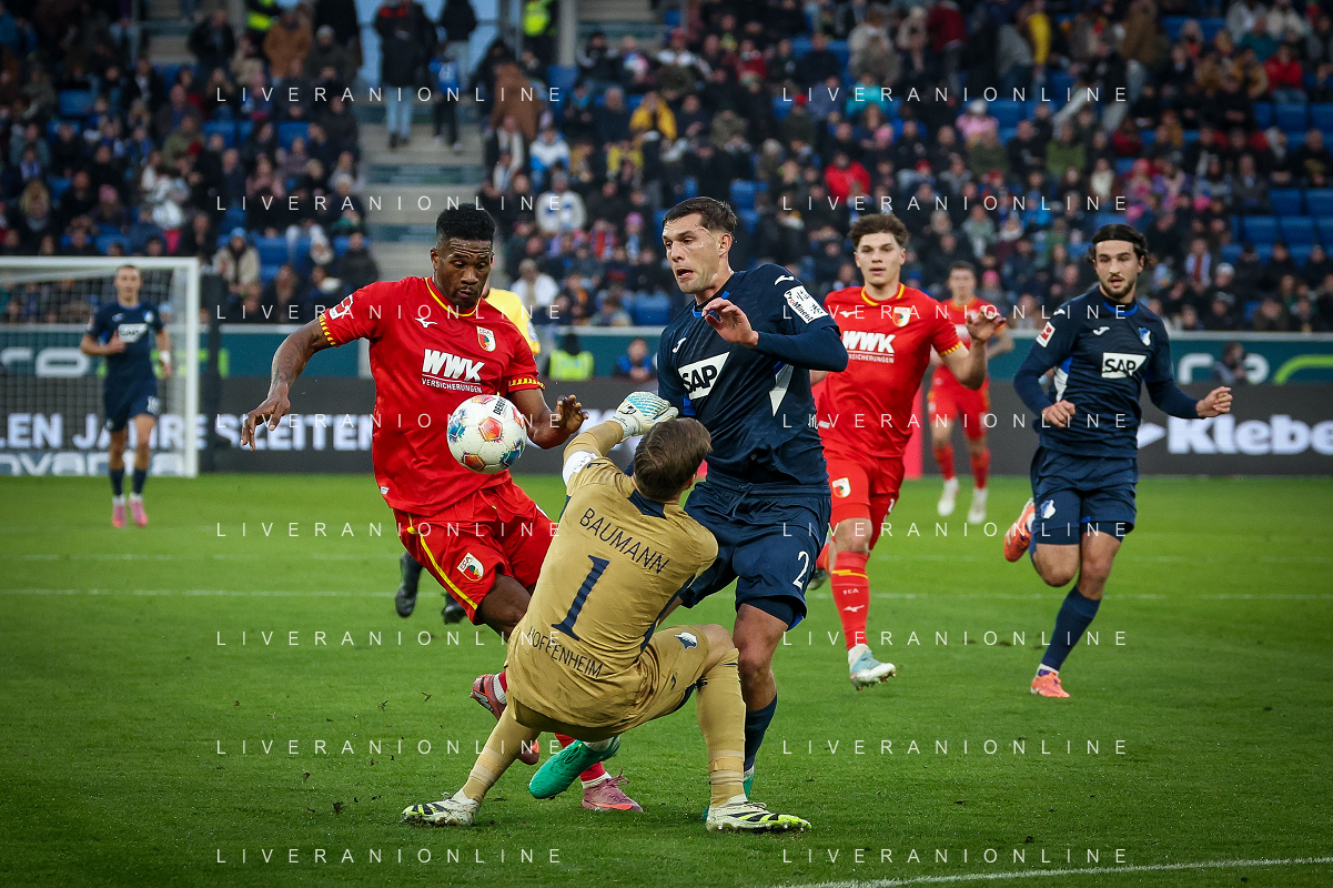 Han-Noah Massengo #4 FC Augsburg), Cedric Zesiger #16 (FC Augsburg), Anton Kade #30 (FC Augsburg), Fabian Rieder #32 (FC Augsburg), Dimitris Giannoulis #13 (FC Augsburg) gruessen die Fans vor Spielbeginn, TSG Hoffenheim vs. FC Augsburg, Fussball, Bundesliga, DFL, Saison 2025/2026, Hinrunde, 12. Spieltag, 29.11.2025 DFB regulations prohibit any use of photographs as image sequences and/or quasi-video / action press AG KARMAPRESS-AG ALDO LIVERANI SAS / AGENZIA ALDO LIVERANI SAS ITALY ONLY EDITORIAL USE ONLY