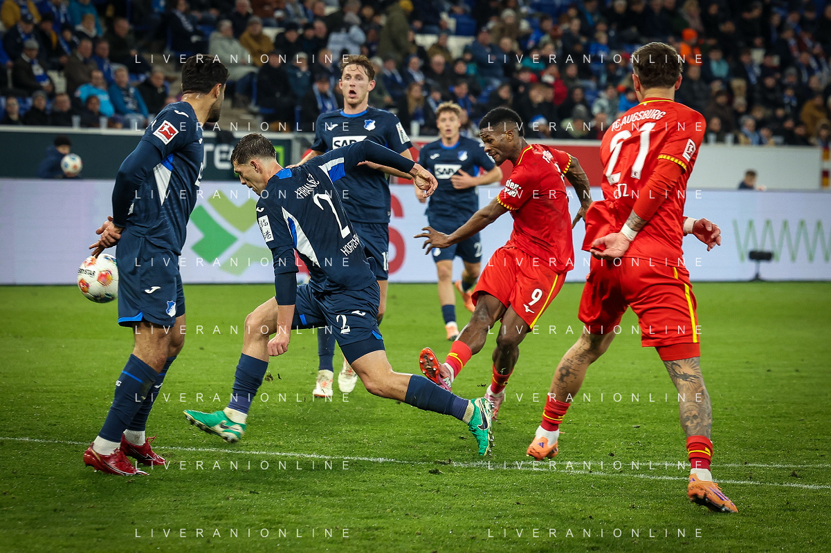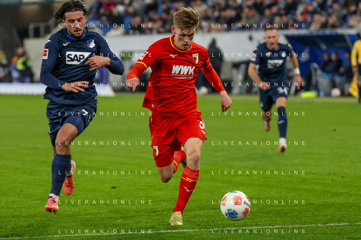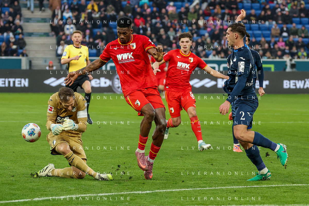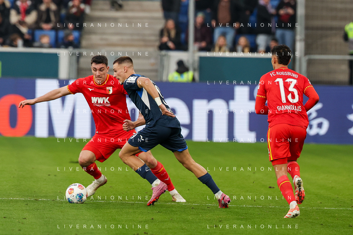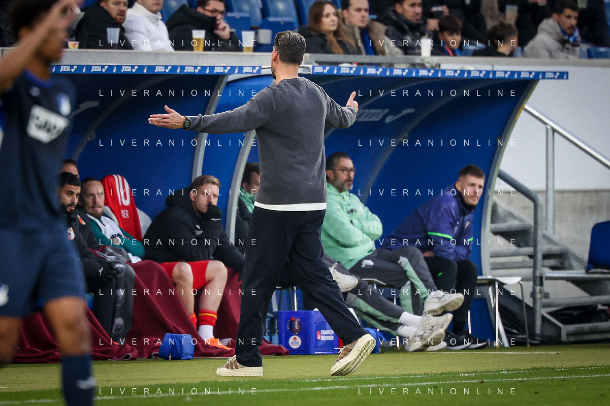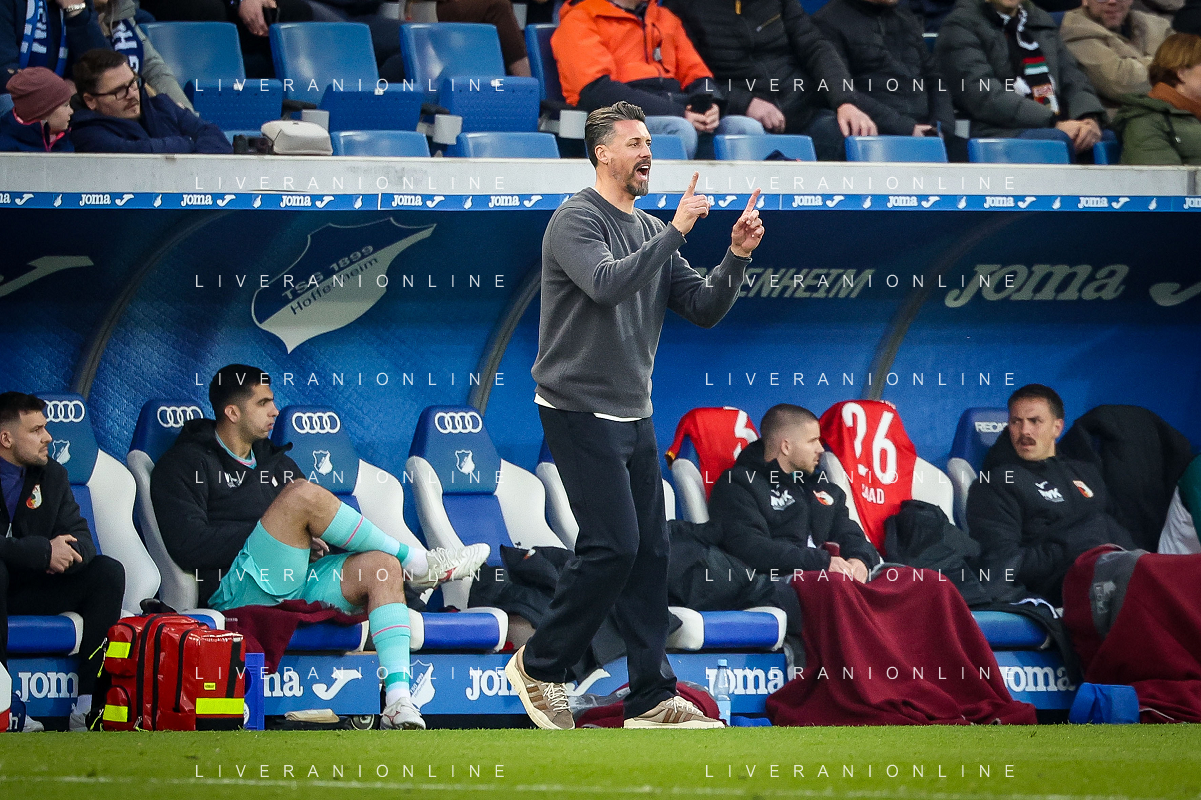 Han-Noah Massengo #4 FC Augsburg), Cedric Zesiger #16 (FC Augsburg), Anton Kade #30 (FC Augsburg), Fabian Rieder #32 (FC Augsburg), Dimitris Giannoulis #13 (FC Augsburg) gruessen die Fans vor Spielbeginn, TSG Hoffenheim vs. FC Augsburg, Fussball, Bundesliga, DFL, Saison 2025/2026, Hinrunde, 12. Spieltag, 29.11.2025 DFB regulations prohibit any use of photographs as image sequences and/or quasi-video / action press AG KARMAPRESS-AG ALDO LIVERANI SAS / AGENZIA ALDO LIVERANI SAS ITALY ONLY EDITORIAL USE ONLY