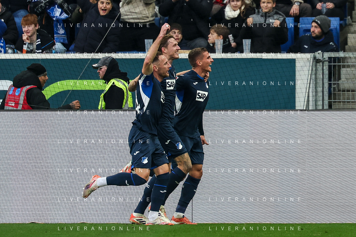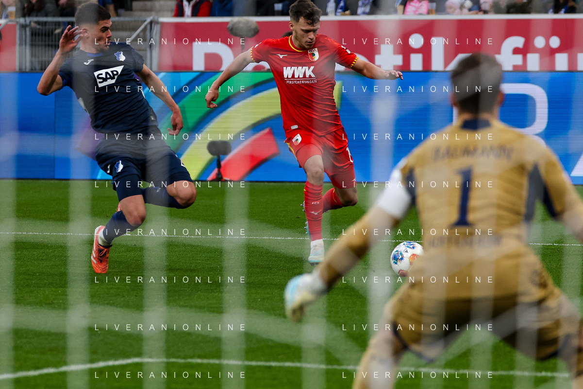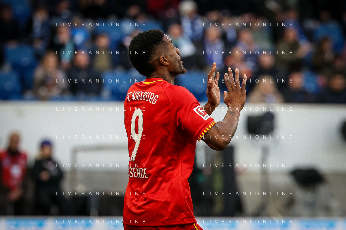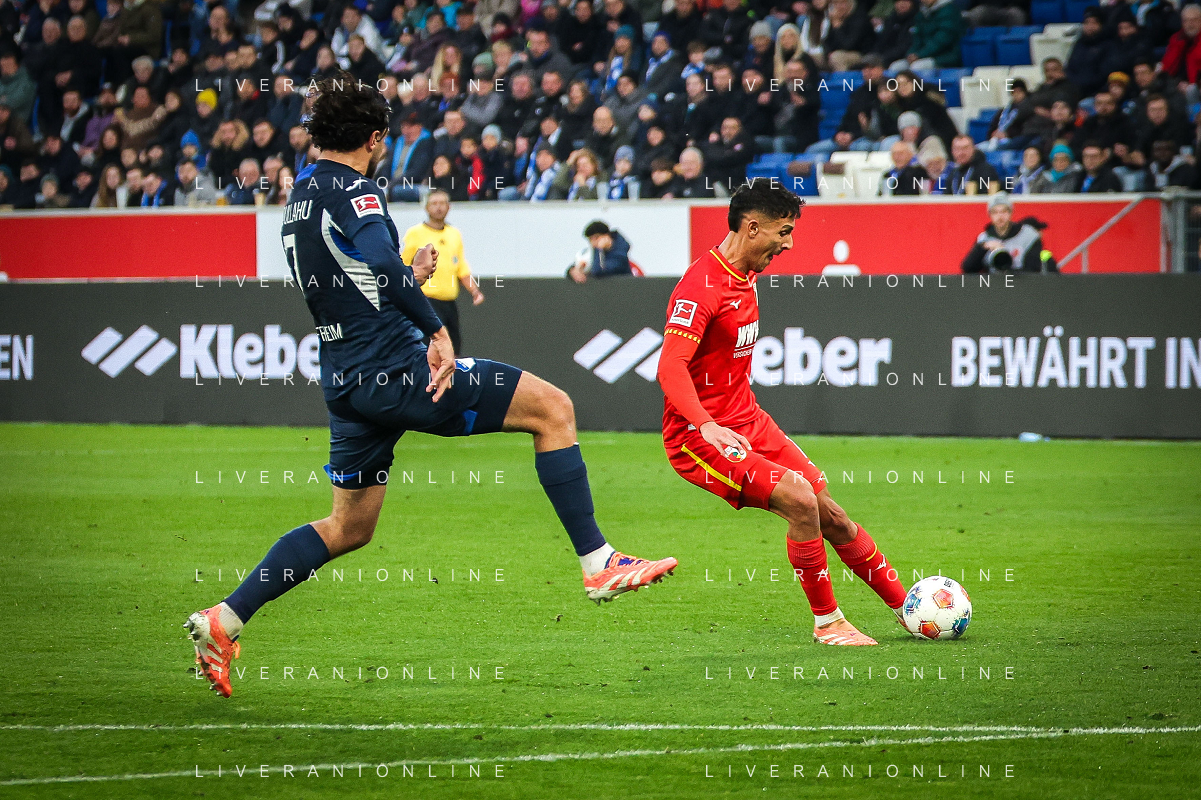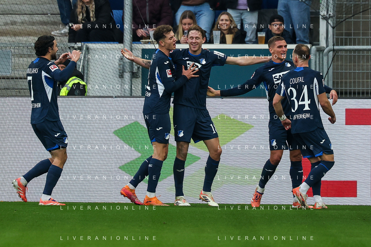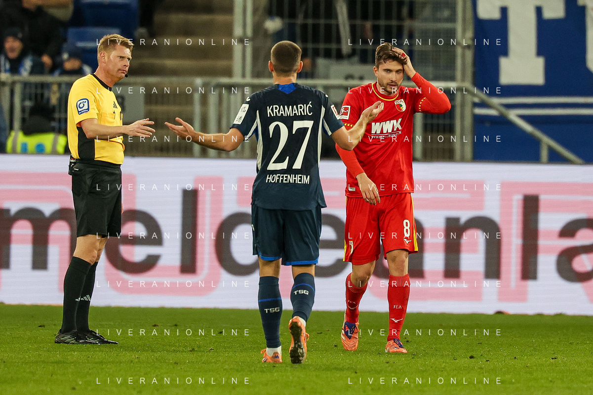 Han-Noah Massengo #4 FC Augsburg), Cedric Zesiger #16 (FC Augsburg), Anton Kade #30 (FC Augsburg), Fabian Rieder #32 (FC Augsburg), Dimitris Giannoulis #13 (FC Augsburg) gruessen die Fans vor Spielbeginn, TSG Hoffenheim vs. FC Augsburg, Fussball, Bundesliga, DFL, Saison 2025/2026, Hinrunde, 12. Spieltag, 29.11.2025 DFB regulations prohibit any use of photographs as image sequences and/or quasi-video / action press AG KARMAPRESS-AG ALDO LIVERANI SAS / AGENZIA ALDO LIVERANI SAS ITALY ONLY EDITORIAL USE ONLY