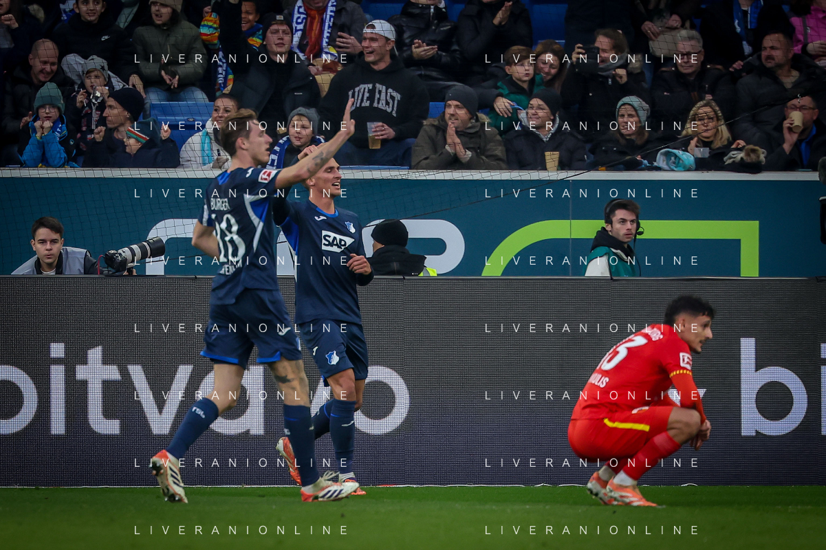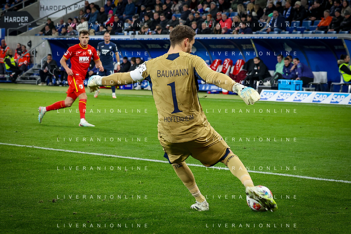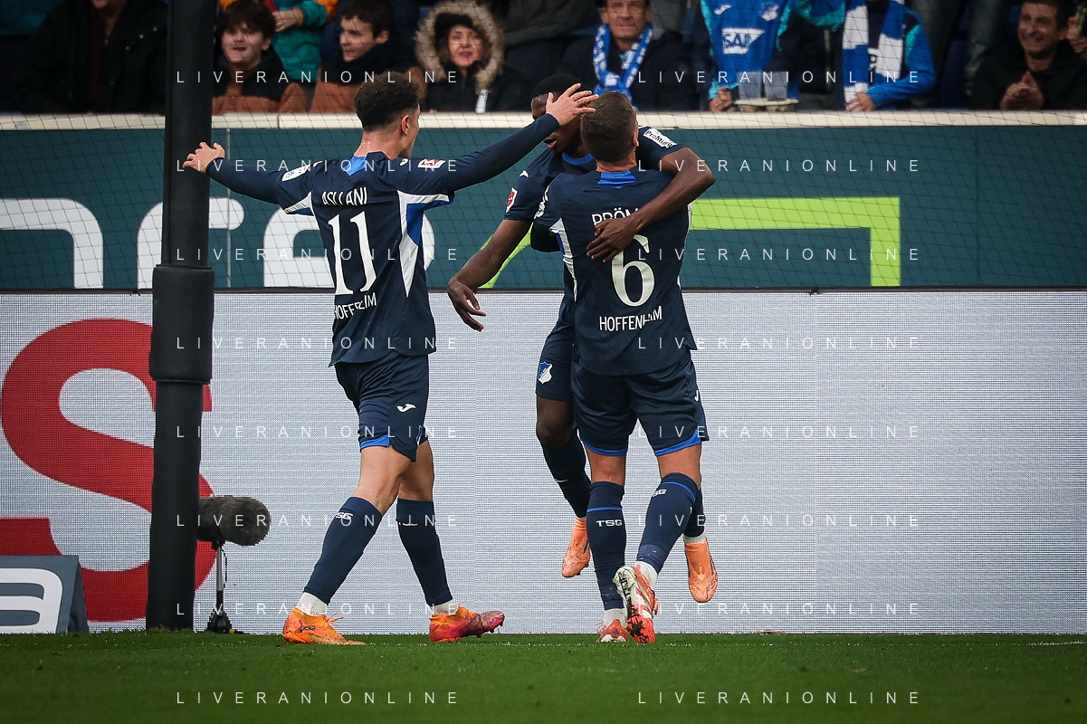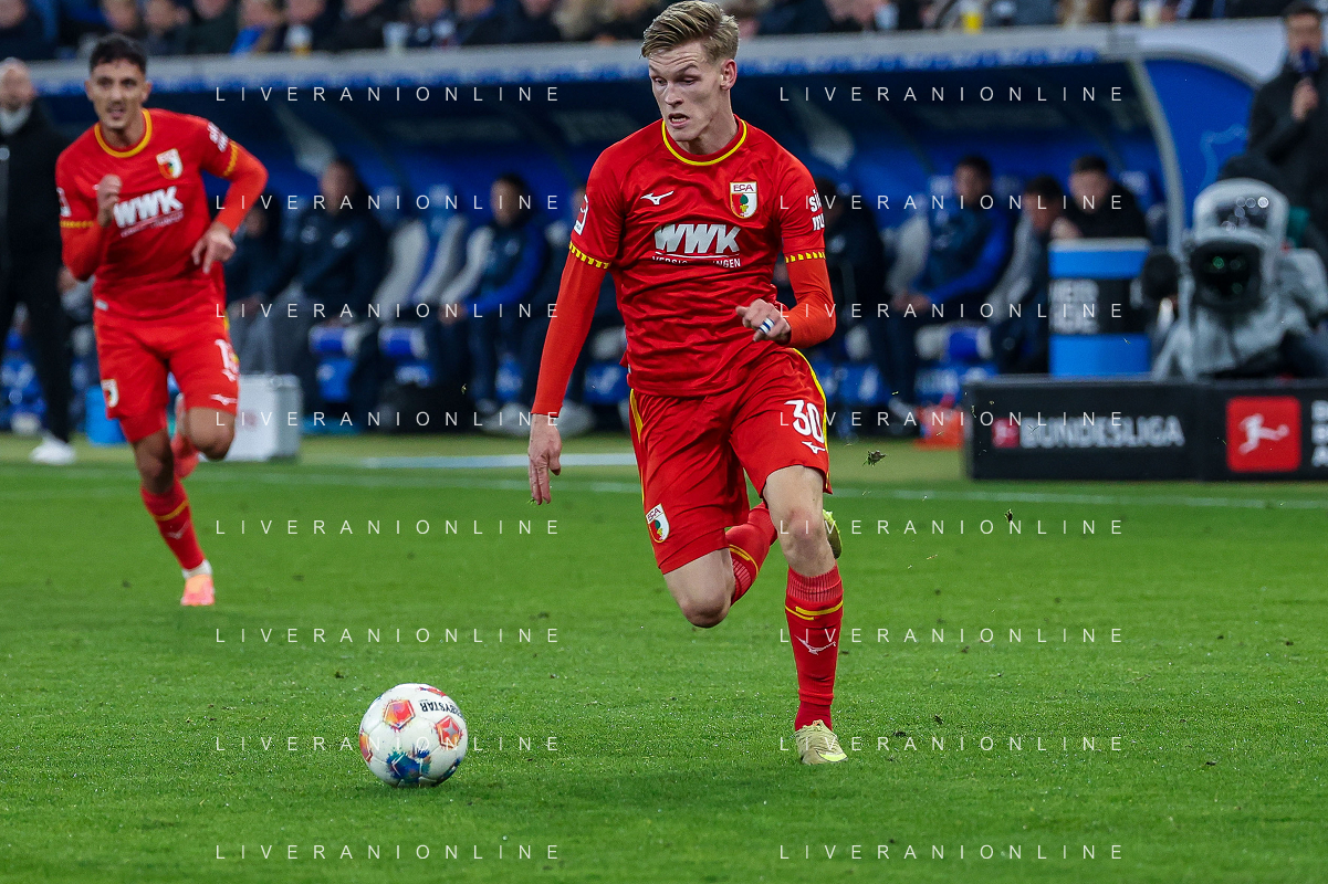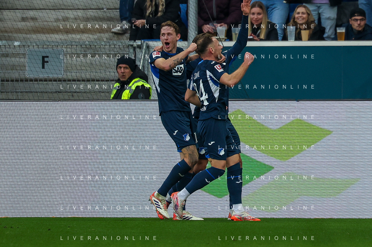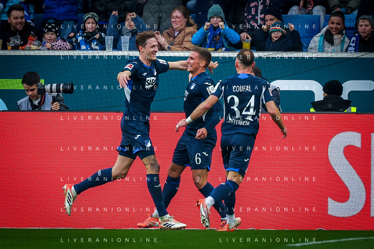 Han-Noah Massengo #4 FC Augsburg), Cedric Zesiger #16 (FC Augsburg), Anton Kade #30 (FC Augsburg), Fabian Rieder #32 (FC Augsburg), Dimitris Giannoulis #13 (FC Augsburg) gruessen die Fans vor Spielbeginn, TSG Hoffenheim vs. FC Augsburg, Fussball, Bundesliga, DFL, Saison 2025/2026, Hinrunde, 12. Spieltag, 29.11.2025 DFB regulations prohibit any use of photographs as image sequences and/or quasi-video / action press AG KARMAPRESS-AG ALDO LIVERANI SAS / AGENZIA ALDO LIVERANI SAS ITALY ONLY EDITORIAL USE ONLY