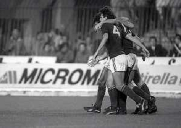 NEG-22-10-1986 TORINO- SEDICESIMI DI FINALE DI ANDATA DI COPPA UEFA TORINO-RABA ETO-4-0 NELLA FOTO ABBRACCI GIOCATORI TORINO DOPO IL GOAL AG ALDO LIVERANI SAS