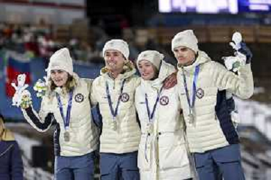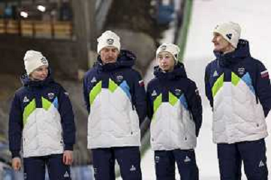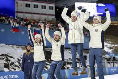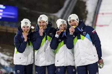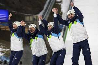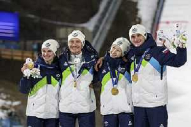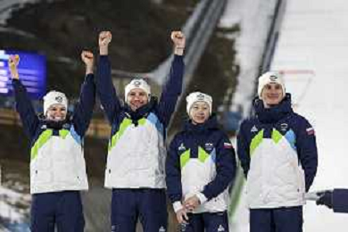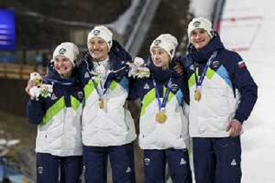 Nika VODAN, SLO, bib nu 11-1, Anze LANISEK, SLO, bib nu 11-2, Nika PREVC, SLO, bib nu 11-3, Domen PREVC, SLO, bib nu 11-4, Podium Photo, Mixed Team Normal Hill HS107 at Ski Jumping Olympic Winter Games 2025-26 in Milano Cortina, Italy, 2026-02-10, Photo Credit: action press / Julia Piatkowska AG KARMAPRESS-AG ALDO LIVERANI SAS