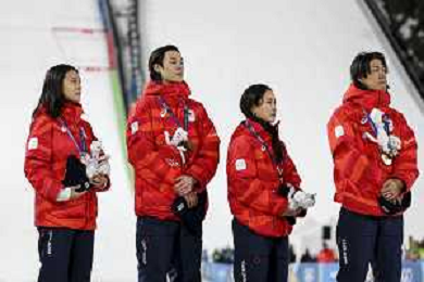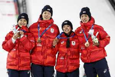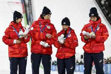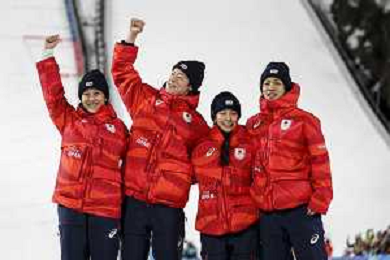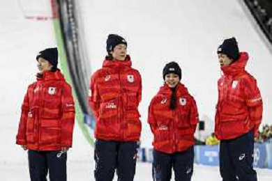Nozomi MARUYAMA, JPN, bib nu 12-1, Ryoyu KOBAYASHI, JPN, bib nu 12-2, Sara TAKANASHI, JPN, bib nu 12-3, Ren NIKAIDO, JPN, bib nu 12-4, Podium Photo, Mixed Team Normal Hill HS107 at Ski Jumping Olympic Winter Games 2025-26 in Milano Cortina, Italy, 2026-02-10, Photo Credit: action press / Julia Piatkowska AG KARMAPRESS-AG ALDO LIVERANI SAS