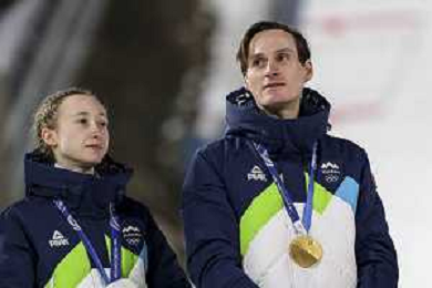 Nika PREVC, SLO, bib nu 11-3, Domen PREVC, SLO, bib nu 11-4, Podium Photo, Mixed Team Normal Hill HS107 at Ski Jumping Olympic Winter Games 2025-26 in Milano Cortina, Italy, 2026-02-10, Photo Credit: action press / Julia Piatkowska AG KARMAPRESS-AG ALDO LIVERANI SAS