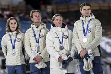 Anna Odine STROEM, NOR, bib nu 8-1, Kristoffer Eriksen SUNDAL, NOR, bib nu 8-2, Eirin Maria KVANDAL, NOR, bib nu 8-3, Marius LINDVIK, NOR, bib nu 8-4, Podium Photo, Mixed Team Normal Hill HS107 at Ski Jumping Olympic Winter Games 2025-26 in Milano Cortina, Italy, 2026-02-10, Photo Credit: action press / Julia Piatkowska AG KARMAPRESS-AG ALDO LIVERANI SAS