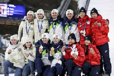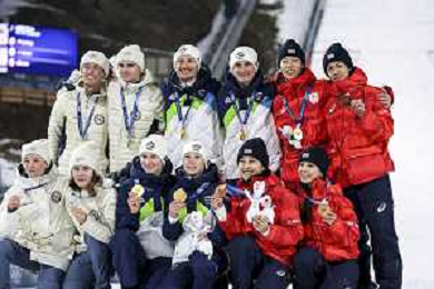 Anna Odine STROEM, NOR, bib nu 8-1, Kristoffer Eriksen SUNDAL, NOR, bib nu 8-2, Eirin Maria KVANDAL, NOR, bib nu 8-3, Marius LINDVIK, NOR, bib nu 8-4, Nika VODAN, SLO, bib nu 11-1, Anze LANISEK, SLO, bib nu 11-2, Nika PREVC, SLO, bib nu 11-3, Domen PREVC, SLO, bib nu 11-4, Nozomi MARUYAMA, JPN, bib nu 12-1, Ryoyu KOBAYASHI, JPN, bib nu 12-2, Sara TAKANASHI, JPN, bib nu 12-3, Ren NIKAIDO, JPN, bib nu 12-4, Podium Photo, Mixed Team Normal Hill HS107 at Ski Jumping Olympic Winter Games 2025-26 in Milano Cortina, Italy, 2026-02-10, Photo Credit: action press / Julia Piatkowska AG KARMAPRESS-AG ALDO LIVERANI SAS