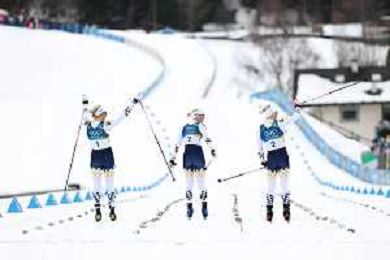 Linn SVAHN, SWE, bib number 1, Maja DAHLQVIST, SWE, bib number 7, Jonna SUNDLING, SWE, bib number 2, Winner Photo, Women's Sprint Final Classic at Cross-Country Olympic Winter Games 2025-26 in Milano Cortina, Italy, 2026-02-10, Photo Credit: action press / Julia Piatkowska AG KARMAPRESS-AG ALDO LIVERANI SAS