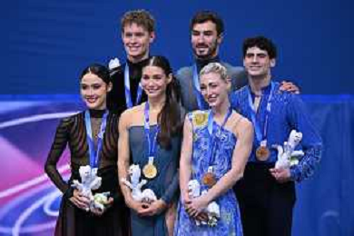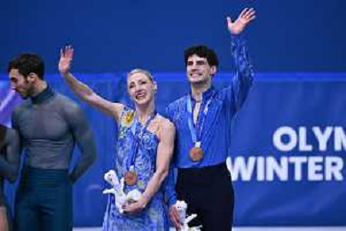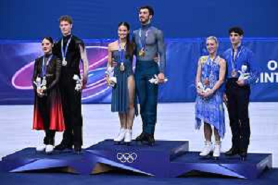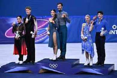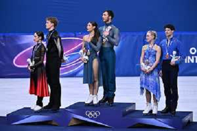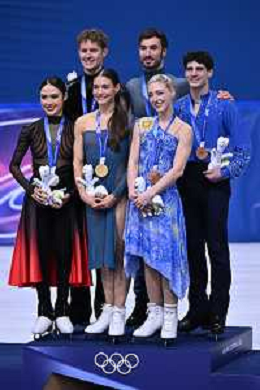 Olimpiadi Milano Cortina 2026 nella foto il podio, da SX Madison Chock e Evan Bates (USA), Laurence Fournier Beaudry e Guillaume Cizeron (FRA), Piper Gilles e Paul Poirier (CAN) Assago (MI) 11-02-2026 Milano Ice Skating Arena Pattinaggio di figura a coppie Danza sul ghiaccio - danza libera foto Roberto Garavaglia/Agenzia Aldo Liverani sas