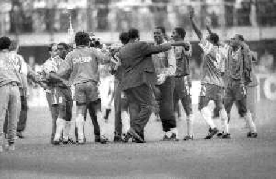 NEG-08-06-1990 MILANO-STADIO MEAZZA PARTITA DEI MONDIALI DI CALCIO ITALIA 90 ARGENTINA-CAMERUN 0-1 NELLA FOTO I GIOCATORI DELLA NAZIONALE DEL CAMERUN ESULTANO A FINE GARA AG ALDO LIVERANI SAS