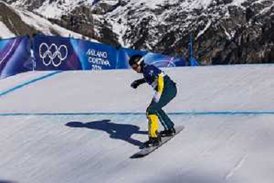 Jarryd HUGHES, AUS, Bib Number 20, Qualification, Action Photo, Men's Snowboard Cross Qualification at Snowboard Olympic Winter Games 2025-26 in Milano-Cortina, Italy, 2026-02-12, Photo Credit: Frank Heinen / Karma Press - AGENZIA ALDO LIVERANI SAS - ITALY ONLY EDITORIAL USE ONLY