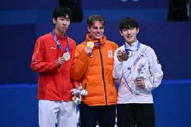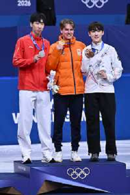 Olimpiadi Milano Cortina 2026 nella foto il podio da SX Long Sun (CHN), Jens van 't Wout (NED) e Jongun Rim (KOR) Assago (MI) 12-02-2026 Milano Ice Skating Arena Short Track - 1.000 metri maschili foto Roberto Garavaglia/Agenzia Aldo Liverani sas