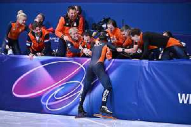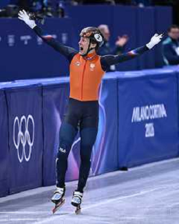 Olimpiadi Milano Cortina 2026 nella foto Jens van 't Wout (NED) festeggia la vittoria con il suo team Assago (MI) 12-02-2026 Milano Ice Skating Arena Short Track - 1.000 metri maschili foto Roberto Garavaglia/Agenzia Aldo Liverani sas