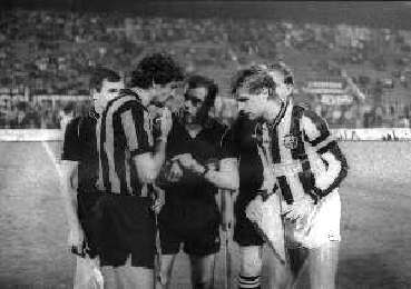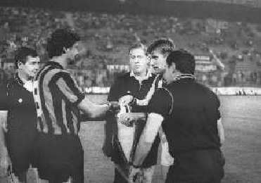 NEG- 21-10-1987- MILANO 2 TURNO DI ANDATA DI COPPA UEFA INTER-TURUN PALLOSEURA 0-1 NELLA FOTO L'ARBITRO WILFRED WALLACE CON I DUE CAPITANI AG ALDO LIVERANI SAS