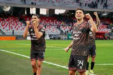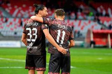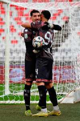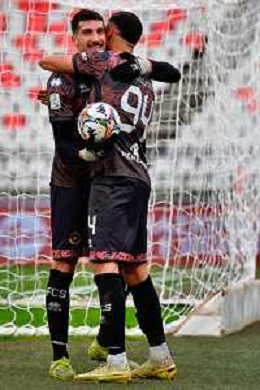TVEM February 15, 2026 Bari, Italy - SSC Bari vs FC Sudtirol - Italian Soccer Serie B 2025/2026 - San Nicola Stadium. In the pic: MERKAJ Silvio of Sudtirol and VESELI Frederic of Sudtirol celebrates the victory ©TVEM Emmanuele Mastrodonato- AGENZIA ALDO LIVERANI SAS