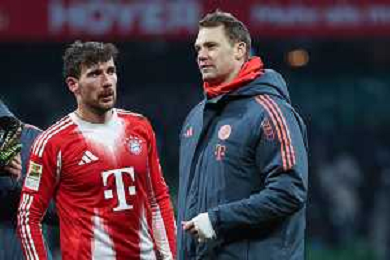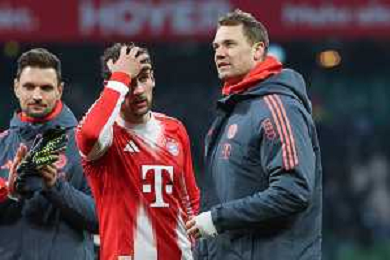 1. Bundesliga - SV Werder Bremen - FC Bayern München am 14.02.2026 im Weserstadion in Bremen Leon Goretzka (Muenchen 8) und Torwart Manuel Neuer (Muenchen 1) nach dem Schlusspfiff Foto: osnapix / Marcus Hirnschal DFB regulations prohibit any use of photographs as image sequences and/or quasi-video / action press AG KARMAPRESS-AG ALDO LIVERANI SAS