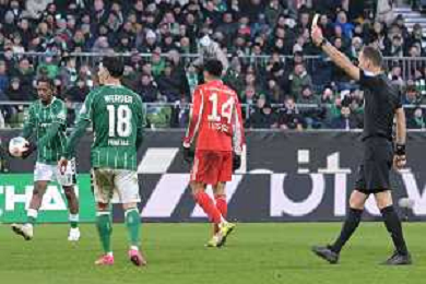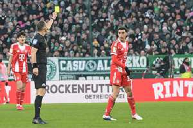 Gelb / gelbe Karte von Schiedsrichter Bastian Dankert an Jamal Musiala (FC Bayern Muenchen #10), SV Werder Bremen - FC Bayern Muenchen, Fussball, Bundesliga, DFL, 14.02.2026 DFB regulations prohibit any use of photographs as image sequences and/or quasi-video / action press AG KARMAPRESS-AG ALDO LIVERANI SAS