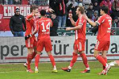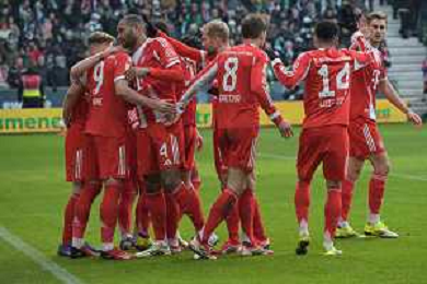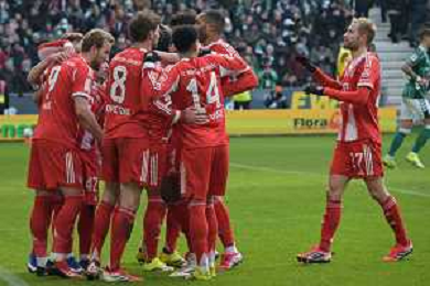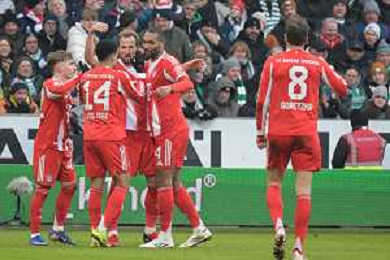 Die Mitspieler gratulieren Harry Kane (FC Bayern Muenchen #9) zu seinem 0:2, SV Werder Bremen - FC Bayern Muenchen, Fussball, Bundesliga, DFL, 14.02.2026 DFB regulations prohibit any use of photographs as image sequences and/or quasi-video / action press AG KARMAPRESS-AG ALDO LIVERANI SAS