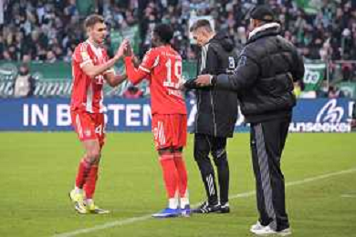 Glueckwunsch zu seinem 0:3, Leon Goretzka (FC Bayern Muenchen #8) links, SV Werder Bremen - FC Bayern Muenchen, Fussball, Bundesliga, DFL, 14.02.2026 DFB regulations prohibit any use of photographs as image sequences and/or quasi-video / action press AG KARMAPRESS-AG ALDO LIVERANI SAS