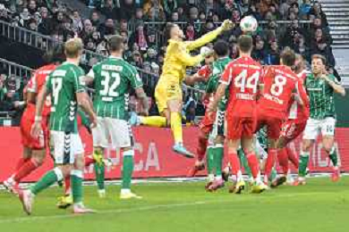 Torwart Mio Backhaus (SV Werder Bremen #30) klaert mit der Faust, SV Werder Bremen - FC Bayern Muenchen, Fussball, Bundesliga, DFL, 14.02.2026 DFB regulations prohibit any use of photographs as image sequences and/or quasi-video / action press AG KARMAPRESS-AG ALDO LIVERANI SAS