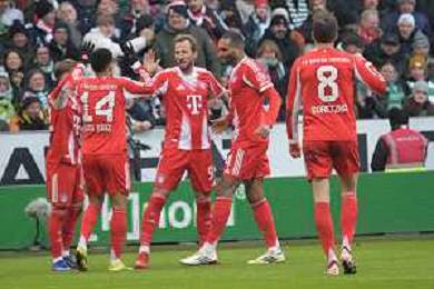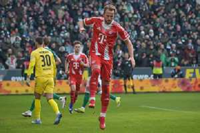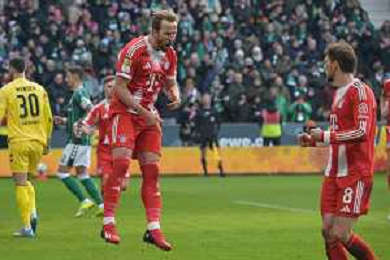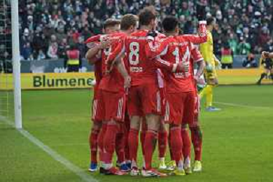 Die Mannschaft feiert Harry Kane (FC Bayern Muenchen #9)nach seinem 0:1, SV Werder Bremen - FC Bayern Muenchen, Fussball, Bundesliga, DFL, 14.02.2026 DFB regulations prohibit any use of photographs as image sequences and/or quasi-video / action press AG KARMAPRESS-AG ALDO LIVERANI SAS