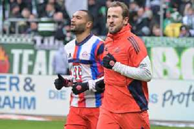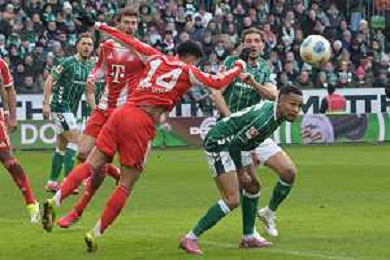 Jonathan Tah (FC Bayern Muenchen #4) links mit Harry Kane (FC Bayern Muenchen #9), SV Werder Bremen - FC Bayern Muenchen, Fussball, Bundesliga, DFL, 14.02.2026 DFB regulations prohibit any use of photographs as image sequences and/or quasi-video / action press AG KARMAPRESS-AG ALDO LIVERANI SAS