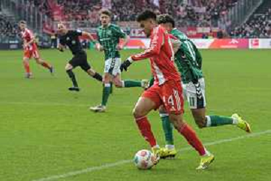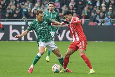 v. li. im Zweikampf Justin Njinmah (SV Werder Bremen #11) mit Luis Diaz (FC Bayern Muenchen #14), SV Werder Bremen - FC Bayern Muenchen, Fussball, Bundesliga, DFL, 14.02.2026 DFB regulations prohibit any use of photographs as image sequences and/or quasi-video / action press AG KARMAPRESS-AG ALDO LIVERANI SAS