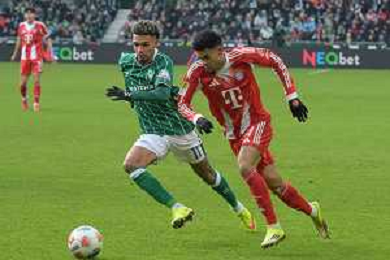 v. li. im Zweikampf Luis Diaz (FC Bayern Muenchen #14) mit Felix Agu (SV Werder Bremen #27), SV Werder Bremen - FC Bayern Muenchen, Fussball, Bundesliga, DFL, 14.02.2026 DFB regulations prohibit any use of photographs as image sequences and/or quasi-video / action press AG KARMAPRESS-AG ALDO LIVERANI SAS