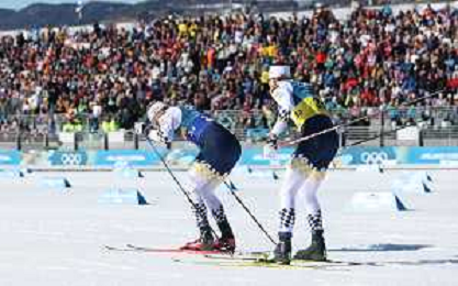 Edvin ANGER, SWE, bib number 3-4, William POROMAA, SWE, bib number 3-3, action photo, Men's 4x7.5km Relay Classic/Free at Cross-Country Olympic Winter Games 2025-26 in Milano Cortina, Italy, 2026-02-15, Photo Credit: action press / Julia Piatkowska AG KARMAPRESS-AG ALDO LIVERANI SAS