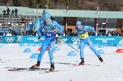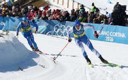 Martino CAROLLO, ITA, Arsi RUUSKANEN, FIN, bib number 9-3, action photo, Men's 4x7.5km Relay Classic/Free at Cross-Country Olympic Winter Games 2025-26 in Milano Cortina, Italy, 2026-02-15, Photo Credit: action press / Julia Piatkowska AG KARMAPRESS-AG ALDO LIVERANI SAS