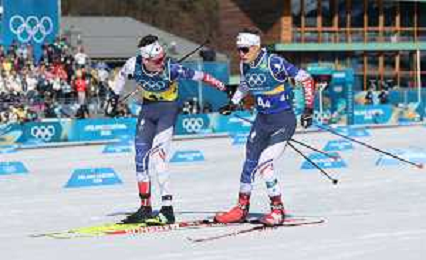 Mathis DESLOGES, FRA, Victor LOVERA, FRA, bib number 4-4, action photo, Men's 4x7.5km Relay Classic/Free at Cross-Country Olympic Winter Games 2025-26 in Milano Cortina, Italy, 2026-02-15, Photo Credit: action press / Julia Piatkowska AG KARMAPRESS-AG ALDO LIVERANI SAS