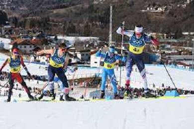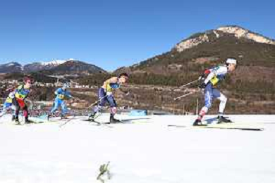 Mathis DESLOGES, FRA, Martino CAROLLO, ITA, Remi DROLET, CAN, action photo, Men's 4x7.5km Relay Classic/Free at Cross-Country Olympic Winter Games 2025-26 in Milano Cortina, Italy, 2026-02-15, Photo Credit: action press / Julia Piatkowska AG KARMAPRESS-AG ALDO LIVERANI SAS