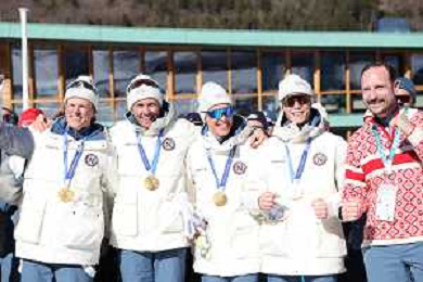 Johannes Hoesflot KLAEBO, Emil IVERSEN, Martin Loewstroem NYENGET, Einar HEDEGART, NOR, Prince HAAKON, winner photo, Men's 4x7.5km Relay Classic/Free at Cross-Country Olympic Winter Games 2025-26 in Milano Cortina, Italy, 2026-02-15, Photo Credit: action press / Julia Piatkowska / KarmaPress - AGENZIA ALDO LIVERANI SAS
