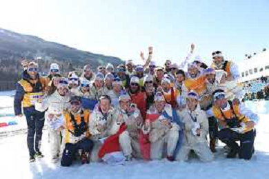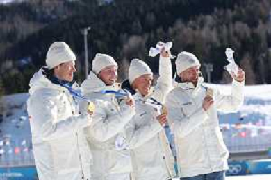 Mathis DESLOGES, with team France, winner photo, Men's 4x7.5km Relay Classic/Free at Cross-Country Olympic Winter Games 2025-26 in Milano Cortina, Italy, 2026-02-15, Photo Credit: action press / Julia Piatkowska / KarmaPress - AGENZIA ALDO LIVERANI SAS