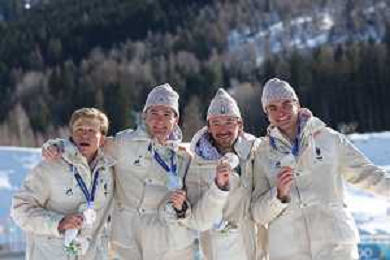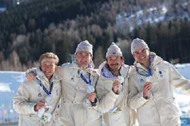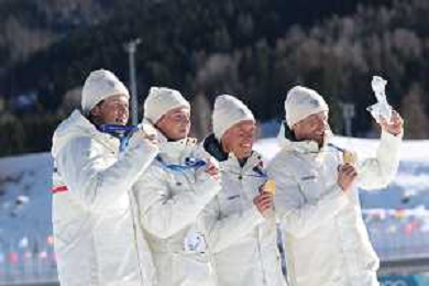 Victor LOVERA, Mathis DESLOGES, Hugo LAPALUS, Theo SCHELY, FRA, podium photo, Men's 4x7.5km Relay Classic/Free at Cross-Country Olympic Winter Games 2025-26 in Milano Cortina, Italy, 2026-02-15, Photo Credit: action press / Julia Piatkowska / KarmaPress - AGENZIA ALDO LIVERANI SAS