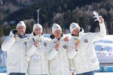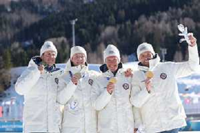 Johannes Hoesflot KLAEBO, Einar HEDEGART, Martin Loewstroem NYENGET, Emil IVERSEN, NOR, podium photo, Men's 4x7.5km Relay Classic/Free at Cross-Country Olympic Winter Games 2025-26 in Milano Cortina, Italy, 2026-02-15, Photo Credit: action press / Julia Piatkowska / KarmaPress - AGENZIA ALDO LIVERANI SAS