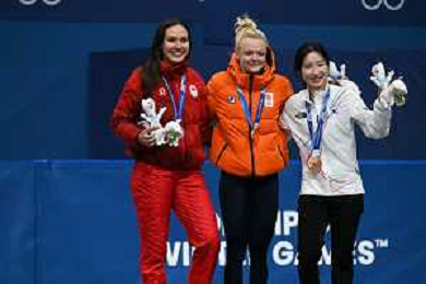 Olimpiadi Milano Cortina 2026 nella foto il podio da SX Courtney Sarault (CAN), Xandra Velzeboer (NED) e Gilli Kim (KOR) Assago (MI) 16-02-2026 Milano Ice Skating Arena Short Track - 1.000m femminili XXV Giochi Olimpici Invernali - Milano Cortina 2026 foto Roberto Garavaglia/Agenzia Aldo Liverani sas
