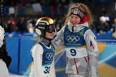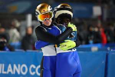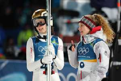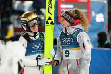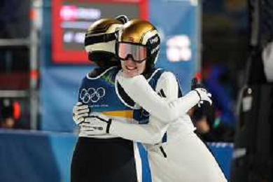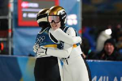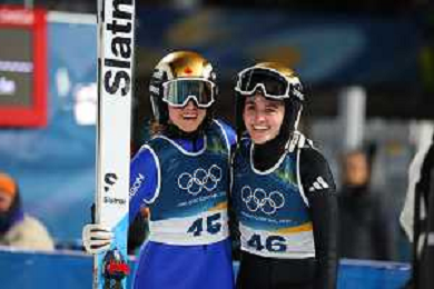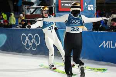 Julia MUEHLBACHER, AUT, Bib number 38, Meghann WADSAK, AUT, Bib number 9, Action Photo, Women's Large Hill HS141 at Ski Jumping Olympic Winter Games 2025-26 in Milano Cortina, Italy, 2026-02-15, Photo Credit: action press / Yohei Osada / KarmaPress - AGENZIA ALDO LIVERANI SAS ITALY ONLY EDITORIAL USE ONLY