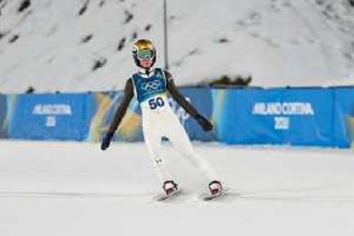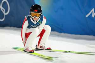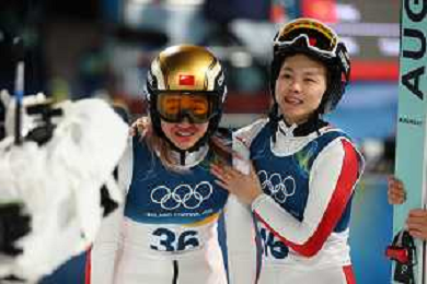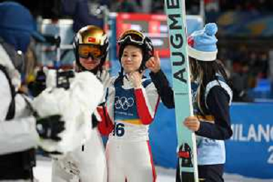 Yangning WENG, CHN, Bib number 8, Run 1, Action Photo, Women's Large Hill HS141 at Ski Jumping Olympic Winter Games 2025-26 in Milano Cortina, Italy, 2026-02-15, Photo Credit: action press / Julia Piatkowska / KarmaPress - AGENZIA ALDO LIVERANI SAS ITALY ONLY EDITORIAL USE ONLY