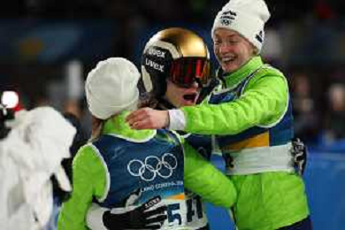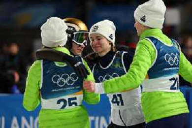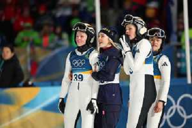 Katra KOMAR, SLO, Bib number 25, Nika PREVC, SLO, Bib number 50, Nika VODAN, SLO, Bib number 41, Maja KOVACIC, SLO, Bib number 21, Winner Photo, Women's Large Hill HS141 at Ski Jumping Olympic Winter Games 2025-26 in Milano Cortina, Italy, 2026-02-15, Photo Credit: action press / Yohei Osada / KarmaPress - AGENZIA ALDO LIVERANI SAS ITALY ONLY EDITORIAL USE ONLY