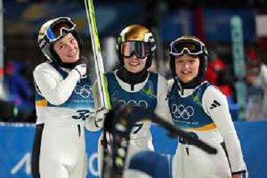Heidi Dyhre TRAASERUD, NOR, Bib number 40, Eirin Maria KVANDAL, NOR, Bib number 39, Silje OPSETH, NOR, Bib number 33, Winner Photo, Women's Large Hill HS141 at Ski Jumping Olympic Winter Games 2025-26 in Milano Cortina, Italy, 2026-02-15, Photo Credit: action press / Yohei Osada / KarmaPress - AGENZIA ALDO LIVERANI SAS ITALY ONLY EDITORIAL USE ONLY